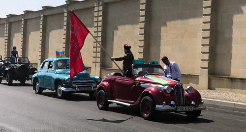 Километровый автопробег к комплексу "Братская могила" совершили сегодня члены ретроавтомобильного клуба "Землячество казаков Азербайджана". При этом в старинном автомобиле, возглавлявшем колонну, была поднята копия знамени, водруженного над Рейхстагом. "Это не какая-то фальшивка, а сертифицированная копия", - пояснил корреспонденту "Кавказского узла" представитель атамана по Северному Азербайджану Сергей Касиков.