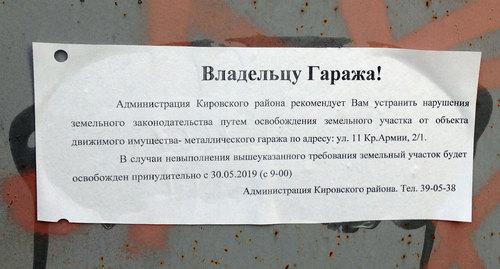 Стоит отметить, что в распоряжении от 8 мая 2019 года главы горадминистрации Радика Харисова (имеется в распоряжении "Кавказского узла"), в котором говорится о необходимости сноса целого ряда построек в разных районах города, в том числе 335 гаражей на Рылеева, никакие объекты по адресу 11-й Красной Армии 2/1 не упоминаются. При этом в распоряжении есть пункт о сносе 25 гаражей на улице Куликова, 64 - это соседняя с улицей 11-й Красной Армии улица, гаражи же расположены между этими двумя улицами.