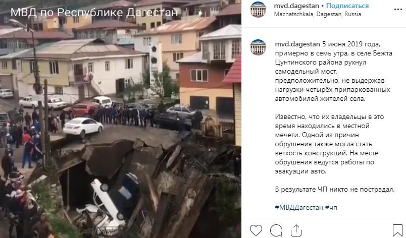 Самодельный мост, обвалившийся в селе Бежта Цунтинского района вместе с несколькими автомобилями, находился в аварийном состоянии, сообщило МЧС. Пользователи Instagram раскритиковали власти за отсутствие в селе качественного переезда.