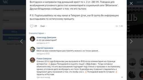 Активист "Ассоциации народного сопротивления" Владимир Бояринов был задержан силовиками, которые доставили его в Волгодонск Ростовской области. Бояринов был отправлен под домашний арест по подозрению в "публичных призывах к экстремизму", говорилось в сообщении, размещенном на странице организации (6349 подписчиков) в социальной сети "ВКонтакте" 10 июня в 22.56 мск. По данным ассоциации, поводом для возбуждения уголовного дела против Бояринова стал комментарий в "ВКонтакте", отмечается в посте, который к 15.50 мск сегодня собрал 26 лайков.