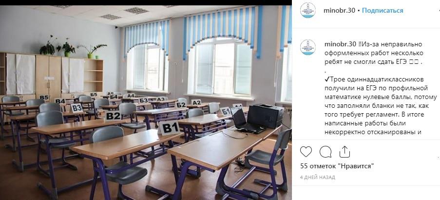 "Трое одиннадцатиклассников получили на ЕГЭ по профильной математике нулевые баллы, потому что заполняли бланки не так, как того требует регламент. В итоге написанные работы были некорректно отсканированы и аннулированы", - говорится в сообщении, опубликованном 13 июня на странице Минобразования Астраханской области на странице в Instagram minobr.30.