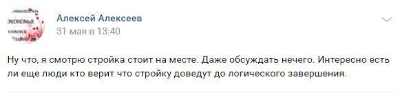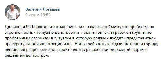 "Дольщики, перестаньте отмалчиваться и ждать. Поймите, что проблема со стройкой есть, что нужно действовать, искать контакты рабочей группы по проблемным стройкам в Туапсе, в которую должны входить представители прокуратуры, администрации и прочие. Надо требовать от администрации города, выдавшей разрешение на строительство, разработки "дорожной" карты с решением долгостроя", - написал 3 июня Валерий Логашев.