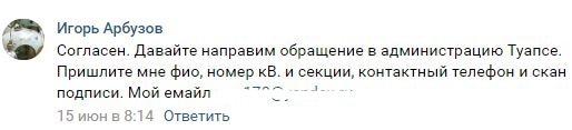 "Согласен. Давайте направим обращение в администрацию Туапсе", - ответил ему Игорь Арбузов 15 июня.