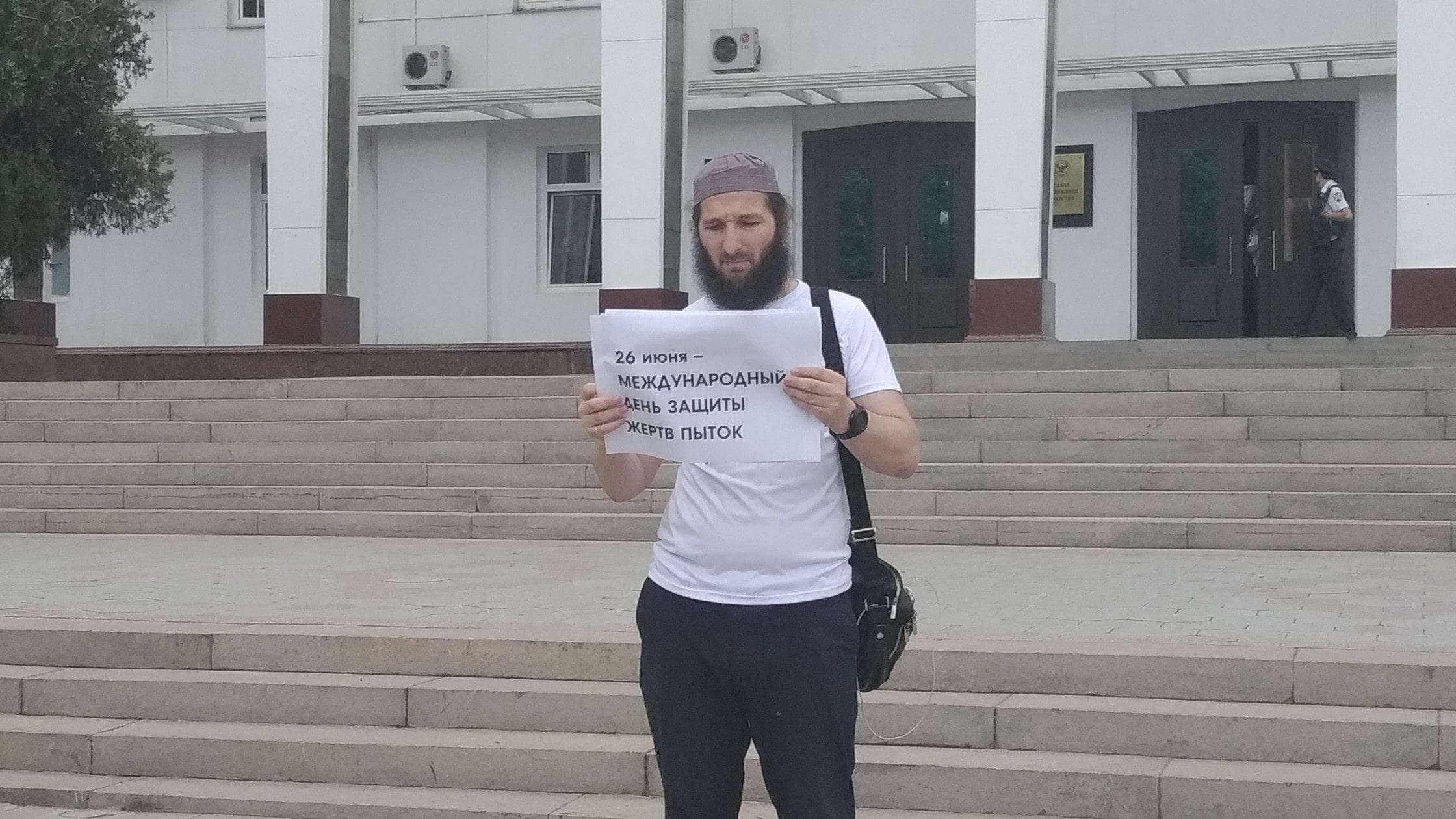 Серию одиночных пикетов в центре Махачкалы в поддержку арестованного журналиста "Черновика" Абдулмумина Гаджиева активисты приурочили к Международному дню защиты жертв пыток.