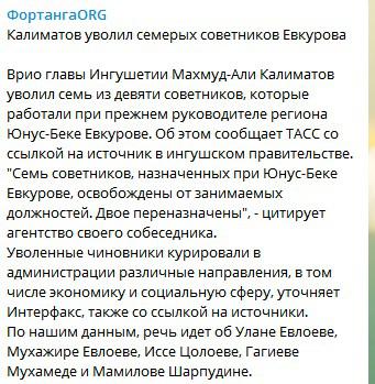 Эту же информацию приводит «Интерфакс», также ссылающийся на свой источник в правительстве Ингушетии. "Калиматов своим указом освободил от занимаемых должностей семь помощников-советников главы республики. При Юнус-Беке Евкурове они курировали в администрации руководителя Ингушетии различные направления: от социального до экономического блока", - рассказал этот источник, также не уточнив, о ком именно идет речь.