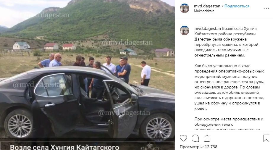 "Установлено, что мужчина, получив огнестрельное ранение, сел за руль, но скончался в дороге. По словам очевидцев, автомобиль внезапно стал съезжать с дорожного полотна, ушел на обочину и опрокинулся в кювет", - говорится в сообщении, опубликованном сегодня на странице МВД Дагестана в Instagram (mvd.dagestan).