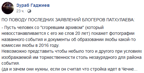 Зураб Гаджиев 22 июля выразил сомнение в озвученной Магомедом Патхулаевым версии. На своей странице в Facebook член Общественной комиссии по уточнению границ Дагестана и Чечни предложил продемонстрировать "фотографии названного события и документы об образовании якобы какой-то комиссии якобы в 2016 году".