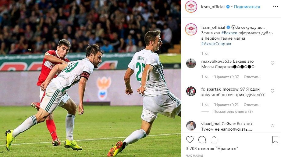 Футболисты грозненского "Ахмата" проиграли московскому "Спартаку" в матче пятого тура Российской премьер-лиги сезона 2019/20.