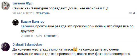 Посетители паблика "Это наш Северный Кавказ" обратили внимание на то, что инцидент нетипичен для чеченского общества. "Шелковской район заселен ногайцами, кумыками, калмыками, русскими (казаки), аварцами... Но как бы там ни было, это ужасно", - написал, в частности, Musa Stoltenberg.