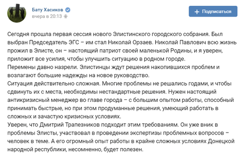 "Нужен настоящий антикризисный менеджер во главе города – с большим опытом работы, способный принимать быстрые, но при этом продуманные решения, умеющий работать в сложных и зачастую кризисных условиях. Уверен, что Дмитрий Трапезников соответствует этим требованиям. Он уже вник в проблемы Элисты, участвовал в проведении экспертизы проблемных вопросов – человек в теме. А его огромный опыт работы в крайне сложных условиях Донецкой народной республики, несомненно, будет полезен", – написал Хасиков. По состоянию на 00.40 мск 27 сентября, пост прокомментировало 40 пользователей, после чего администратор страницы ограничил возможность комментировать, публикация понравилось 49 пользователям. Публикация на эту же тему на странице Хасикова в Instagram набрала 1406 отметок "нравится".