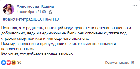 "Как и принято в начале учебного года, почти все мои посты посвящены правам детей на бесплатное образование... Полагаю, что родитель, платящий мзду, делает это целенаправленно и добровольно, ведь ни единожды не были они склонены к уплате под страхом смертной казни или ещё чего опасного. Посему, заявления о принуждении я считаю вымышленными и необоснованными. Кто хочет, тот добьется вполне законно", - написала в Facebook волгоградка Анастасия Юдина.