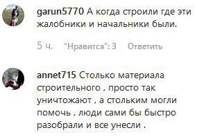 "Столько материала строительного просто так уничтожают, а стольким могли помочь, люди сами бы быстро разобрали и все унесли", – написал annet715. "Жалко, столько денег на ветер. А с другой стороны можно было по закону начать стройку", – поделился kitikatik_.