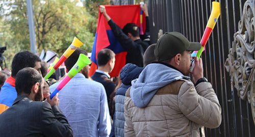 Участники акции принесли с собой транспаранты с различными надписями: "Нет ратификации Стамбульской конференции" на трёх языках - армянском, русском и английском, "Нет конвенции", плакаты с требованием держаться подальше от традиционной семьи, а также флаги с символикой организаторов и армянский триколор. Протестующие скандировали: "Нет ратификации!" и трубили в вувузелы, сообщил корреспондент "Кавказского узла".