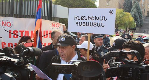 На акции организаторы заявили, что ратификация конвенции разрушает общественные устои и ценности, несмотря на это, правящая фракция "Мой шаг" проводит закрытое обсуждение с делегацией Совета Европы по вопросу ратификации, заявил лидер движения "Воля" Ваагн Чахалян.