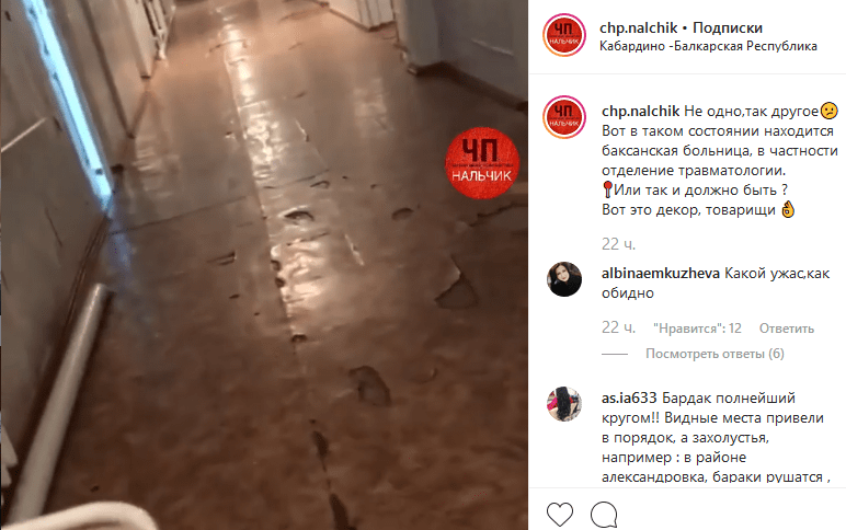 Съемка опубликованного в соцсети видео была произведена в коридоре помещения. На кадрах видны дыры в линолеуме, трещины на стене, деревянный подоконник, краска белого цвета на котором потрескалась. Видео вызвало бурное обсуждение пользователей Instagram, которые рассказали об ужасном состоянии травматологического отделения Баксанской больницы.