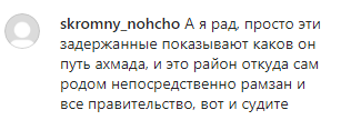 "А я рад, просто эти задержанные показывают, каков он, путь Ахмада, и это район, откуда сам родом непосредственно Рамзан и все правительство. Вот и судите", - отметил skromny_nohcho.