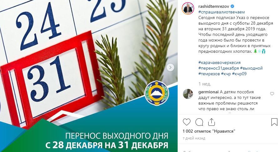 «Чтобы последний день уходящего года можно было бы провести в кругу родных и близких в приятных предновогодних хлопотах», - прокомментировал подписанный указ Рашид Темрезов на своей странице в соцсети Instagram 9 декабря.
