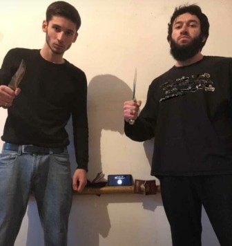 На нем запечатлены двое мужчин с ножами в руках, за ними на полке установлен смартфон с флагом запрещенной в России террористической организации "Исламское государство" и лежат разорванные паспорта граждан России. Отметим, что аналогичным образом выглядит присяга, которую приносят ИГ*.