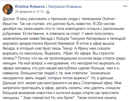 В 20-х числах декабря 2019 года был записан эфир с участием спортсменов Ирины Макеевой и Тимура Айлярова, написала она 26 февраля на своей странице в Facebook. "В итоге в эфир вышла беседа, в который участвует лишь Тимур. А Ирину нам сказали вырезать по максимуму... Потому что мы не пропагандируем мужские виды спорта среди женщин", - написала Кристина Кокаева.
