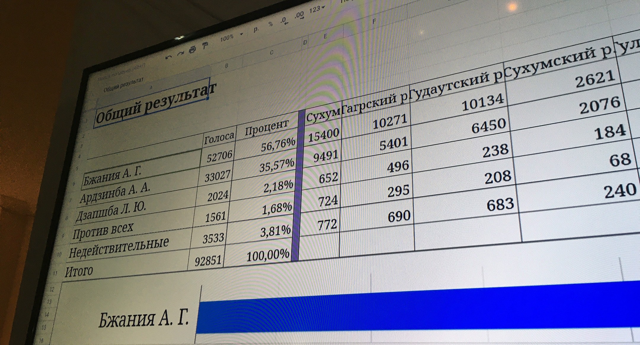 После 23.00 был подсчитано 92851 голос избирателей. Из них, согласно данным ЦИК, 52706 избирателей (56,76%) проголосовали за Аслана Бжанию. За Адгура Ардзимбу было отдано 33027 голосов (35,57%).