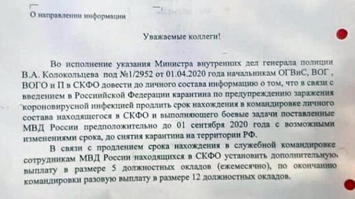 Как писал "Кавказский узел", руководитель правозащитной организации "Машр" Магомед Муцольгов обратился к главе МВД с просьбой разъяснить, является ли отправка силовиков в СКФО из других регионов признаком недоверия местным сотрудникам правоохранительных органов. Опубликованный в интернете фрагмент фотокопии соответствующего письма, подписанного генерал-майором полиции Мишагиным, Муцольгов разместил в своем блоге на «Кавказском узле». Ульяновское управление МВД России назвало не соответствующей действительности информацию о пяти ежемесячных окладах силовикам, командированным в СКФО в связи с карантином.