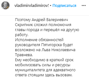 "Андрей Валериевич Скрипник сложил полномочия главы города и перешёл на другую работу", - написал сегодня Владимир Владимиров на своей странице в Instagram. По словам главы региона, изменений в управлении городом потребовала сложившаяся эпидобстановка по коронавирусу. В Пятигорске наблюдается "опережающая динамика и резкий рост числа заболевших за несколько минувших дней", - написал Владимиров, не указав количества зараженных в городе.