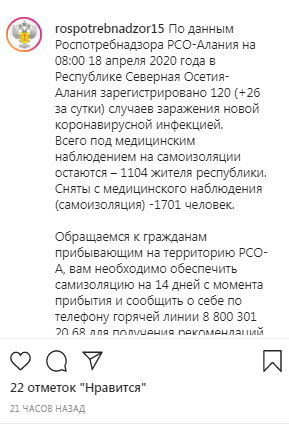 К 18 апреля в Северной Осетии-Алания зарегистрировано 120 случаев заражения новой коронавирусной инфекцией, сообщило управление Роспотребнадзора по Северной Осетии на своей странице в Instagram.