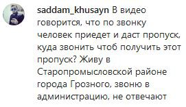 Несколько пользователей адресовали властям недовольство тем, что не могут получить пропуск. "В видео говорится, что по звонку человек приедет и даст пропуск, куда звонить, чтоб получить этот пропуск? Живу в Старопромысловском районе города Грозного, звоню в администрацию, не отвечают", - посетовал, в частности, saddam_khusayn.