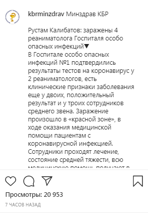 Коронавирусной инфекцией заразились 50 медицинских работников, сообщил сегодня в видеообращении на странице Минздрава Кабардино-Балкарии в Instagram глава министерства Рустам Калибатов. От риска заражения не застрахован никто, тем более медицинские работники первичного звена, отметил он.