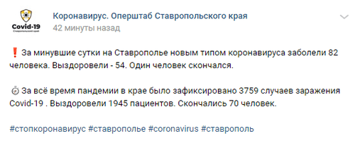 За прошедшие сутки скончался один пациент с коронавирусом, общее число смертей зараженных COVID-19  возросло до 70, сообщил сегодня губернатор Ставропольского края Владимир Владимиров на своей странице в Instagram.