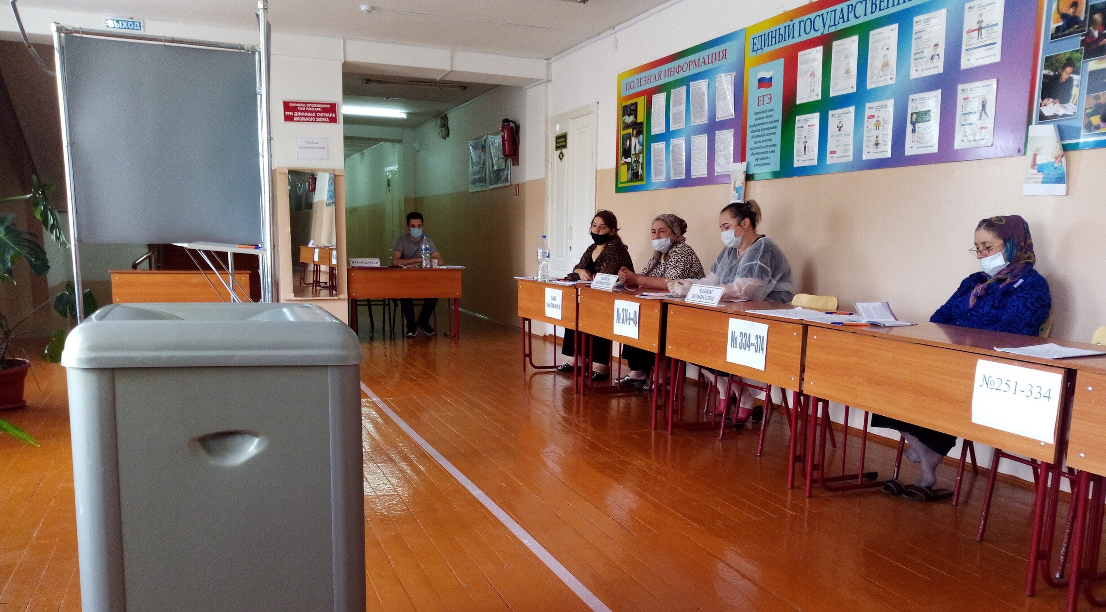 Избирательный участок №1021 расположен на втором этаже школы №12 Махачкалы. Пол в помещении расчерчен разметкой, помогающей людям держаться друг от друга на социальной дистанции, сообщил корреспондент "Кавказского узла". Зелеными стрелками указаны направления к ширме для голосования. Столы с членами комиссии стоят друг от друга на безопасном расстоянии, а у членов комиссии имеются не только медицинские маски, но и защитные экраны. Урна установлена прозрачная.