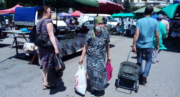 Корреспондент "Кавказского узла" побывала на ней после 10.00 мск 12 июля. Торгующих было меньше примерно на треть, чем обычно, при этом средств индивидуальной защиты на них замечено не было – ни масок, ни перчаток.