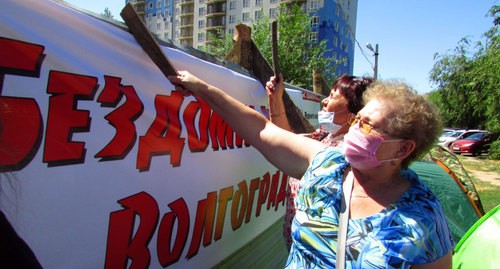 Собственники квартир стали устанавливать у ворот палатки и развешивать на заборе плакаты с лозунгами: «Бездомный полк Волгограда», «Власти Волгограда, помогите обманутым дольщикам ЖК «Адмиралтейский», «Верните наше! Чужого не надо», «Мы бомжи, спасите, власти», «Обманутые дольщики – позор власти», «Позволили украсть – достройте из бюджета». На ворота активисты прикрепили большой портрет губернатора Андрея Бочарова. Рядом с ним встала женщина с плакатом «А.И. Бочаров! Вы же офицер. Держите слово», передал присутствовавший на месте события корреспондент «Кавказского узла».