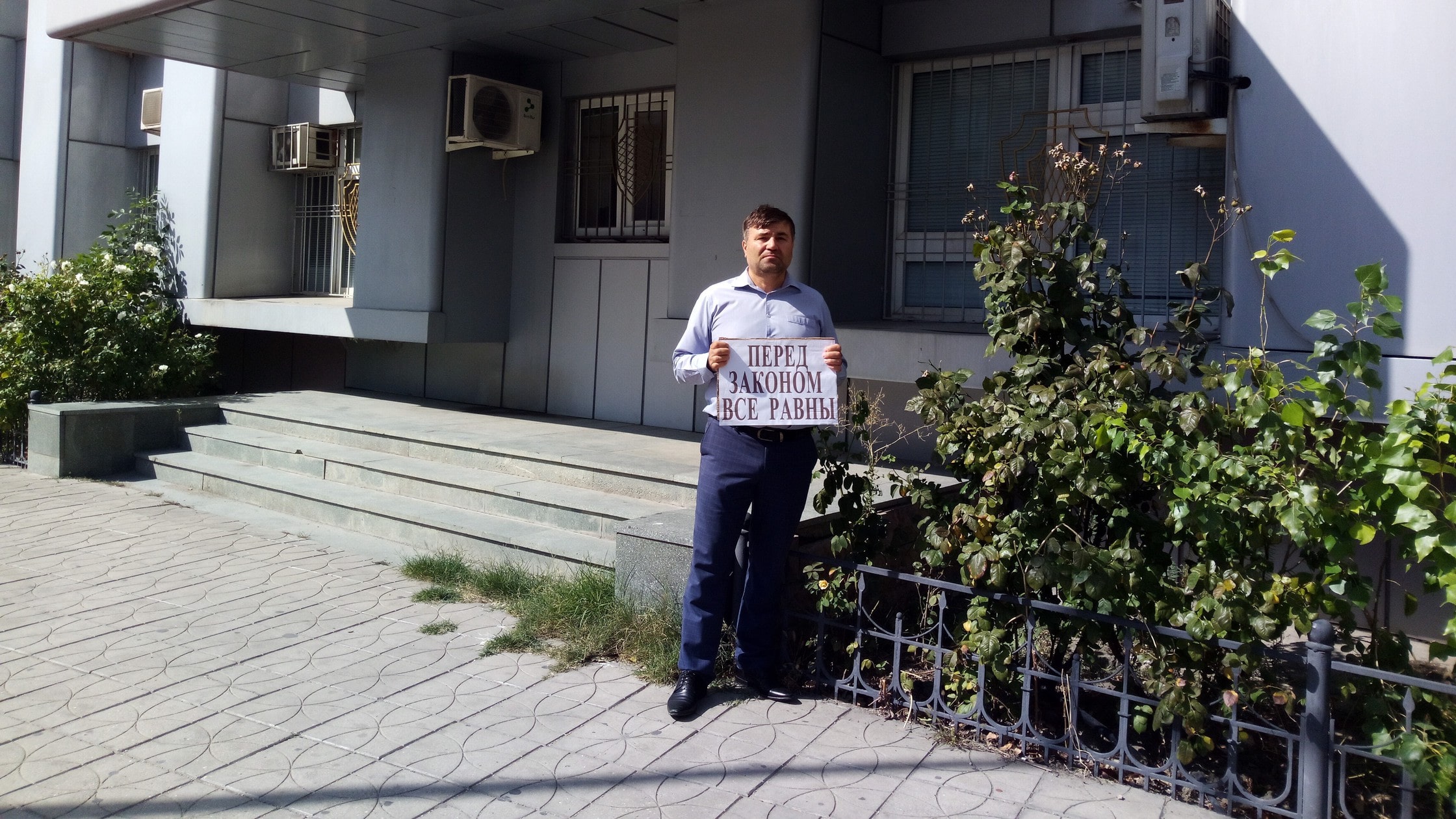 Глава села Гунзиб Шамиль Магомедов вышел сегодня к зданию прокуратуры Дагестана с плакатом, на одной из сторон которого написал: "Перед законом все равны". Глава села Хашархота Израил Иманалиев стоял в нескольких десятках метров от Магомедова и держал плакат, где указал на недопустимость покрытия преступлений надзорным ведомством, передал корреспондент "Кавказского узла".