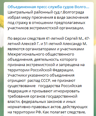 Главой региональной "ячейки" организации является 41-летний волгоградец, он позиционирует себя как "временно исполняющий обязанности главы всех без исключения должностей, всех без исключения ранее существовавших объектов и субъектов права в пространстве на территории Волгоградской области", считает следствие. Все трое отрицают распад СССР, не признают существование Российской Федерации и призывают игнорировать требования органов государственной власти, федеральных законов и иных действующих нормативных актов, утверждают следователи.