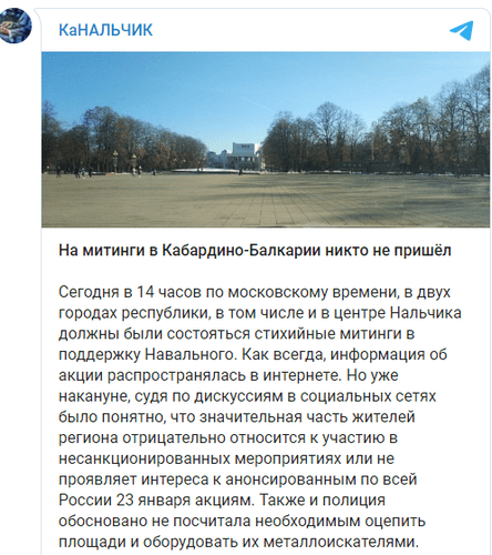 В других населенных пунктах Кабардино-Балкарии на протест никто не вышел. "Сегодня (23 января) в 14 часов по московскому времени в двух городах республики, в том числе и в центре Нальчика должны были состояться стихийные митинги в поддержку Навального. Как всегда, информация об акции распространялась в интернете. Но уже накануне, судя по дискуссиям в социальных сетях, было понятно, что значительная часть жителей региона отрицательно относится к участию в несанкционированных мероприятиях или не проявляет интереса к анонсированным по всей России 23 января акциям. Также и полиция обосновано не посчитала необходимым оцепить площади и оборудовать их металлоискателями", - сообщил Telegram-канал "КаНальчик".