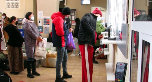 В вестибюле вокзала скопилось много пассажиров. У кассы выстроилась небольшая очередь. В креслах ожидали поезда женщины и пожилые пассажиры, у окон за их спинами и у выхода на перрон сидели на корточках у батарей отопления молодые люди. Все они были в масках, некоторые из них - в перчатках. Стоявшие в очереди мигранты рассказали корреспонденту "Кавказского узла" что билеты в кассе есть, и они уверены, что смогут попасть на поезд.