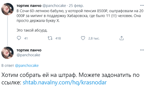 "В Сочи 60-летнюю бабулю, у которой пенсия 8500 рублей, оштрафовали на 20 000 рублей за митинг в поддержку Хабаровска, где было 11 (!!!) человек. Она просто держала букву Х (буква из слова "Хабаровск". - Прим. "Кавказского узла"). Это такой абсурд", - написала 25 февраля координатор штаба Навального в Краснодаре Анастасия Панченко в своем Twitter.