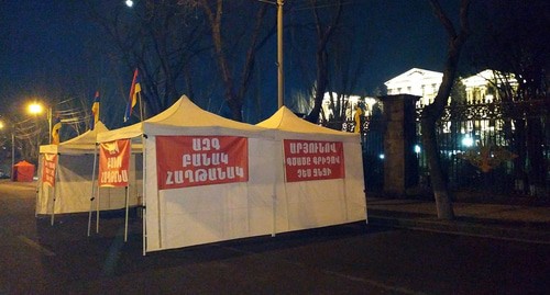 Представители оппозиционных партий размещаются в отдельных палатках. Непосредственно напротив здания парламента находятся палатки Республиканской партии Армении, партии "Процветающая Армения" и партии "Родина". Отдельно, метрах в 80 от этих палаток, ближе к перекрестку Баграмяна - Демирчяна установлена палатка партии "Дашнакцутюн", на которой развешаны фотографии с фронта.