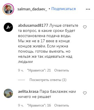 "Лучше ответьте на вопрос, в какие сроки будет восстановлена подача воды. Мы же не в 17-м веке живём. Если нужна помощь, готовы выехать, но нельзя же так издеваться над людьми", – написал abdusamad8177.