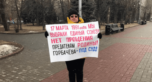 "Сегодня 30 лет со дня референдума 1991 года по сохранению обновленного Советского Союза. Мы вышли для того, чтобы людям об этом напомнить, а также потребовать, чтобы провели суд над [теми], по чьей вине развалился СССР", - сказала корреспонденту "Кавказского узла" Татьяна Педан.