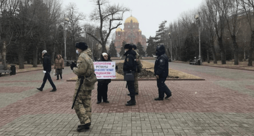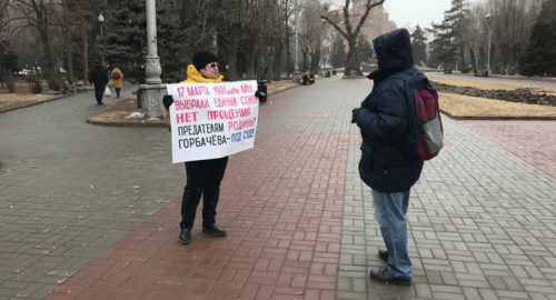 Активистки движения "Левый фронт" Татьяна Педан и Надежда Вялова провели 17 марта одиночные пикеты на Аллее Героев. Они по очереди в руках держали плакаты: "Остановим реванш антисоветизма! Социализм – будущее человечества!", "17 марта 1991 года мы выбрали единый Союз! Нет прощения предателям Родины!", передал корреспондент "Кавказского узла".