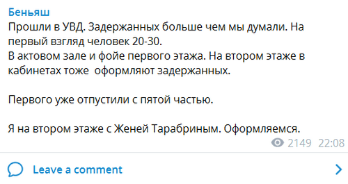 Задержанных от двух до трех десятков человек, сообщил адвокат Михаил Беньяш. "Прошли в УВД. Задержанных больше, чем мы думали. На первый взгляд, человек 20-30. (Они) в актовом зале и фойе первого этажа. На втором этаже в кабинетах тоже оформляют задержанных. Первого уже отпустили", - написал он около 22.00 мск в своем Telegram-канале. Беньяш также отметил, что он "на втором этаже с Женей Тарабриным", его задержание оформляют.