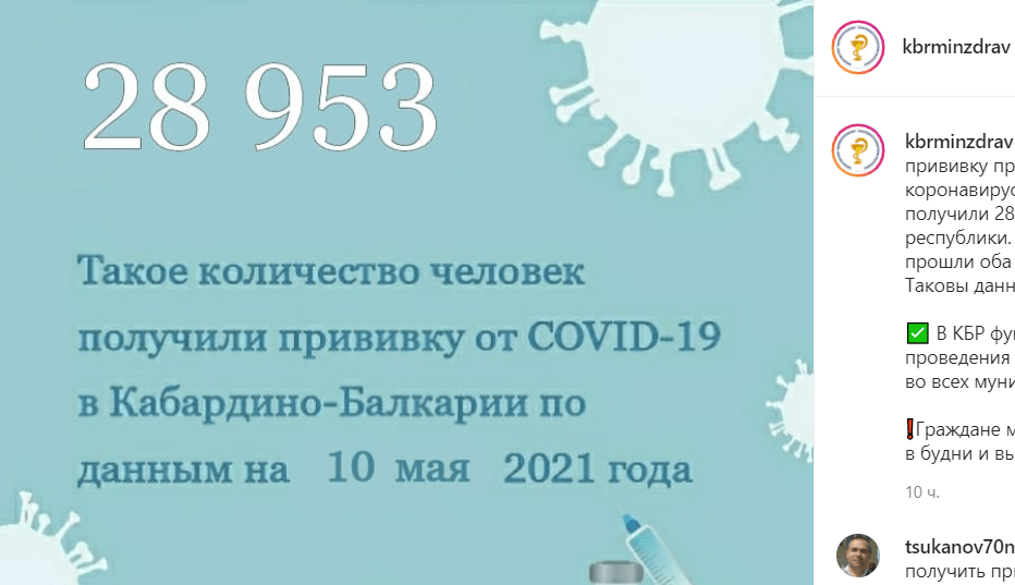 Почти 29 тысяч жителей республики привиты от коронавируса, отчитался Минздрав Кабардино-Балкарии. Вакцинация в республике не всегда добровольна, некоторым приходится прививаться под угрозой увольнения, сообщили пользователи Instagram.