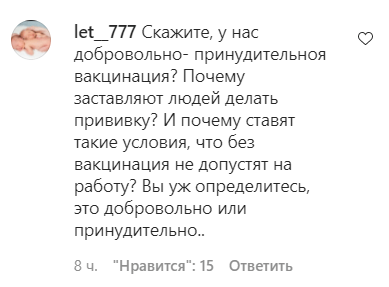 "Скажите, у нас добровольно-принудительная вакцинация? Почему заставляют людей делать прививку? И почему ставят такие условия, что без вакцинации не допустят на работу? Вы уж определитесь, это добровольно или принудительно", - заметила пользователь let__777.