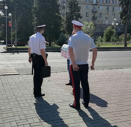 Вышедший на пикет Сергей Инталев пояснил, что проводит его с требованием прекратить политические репрессии и отменить трехдневное голосование. "Человека, который просит мирным способом каких-то изменений, нужно слушать. В нашем случае это происходит карательными методами. Даже конкретно в мое случае. Вот сейчас под деревом стоят пять сотрудников полиции. Когда лично мне нужна была помощь и я позвонил и сообщил о преступлении, они не приехали. Сейчас их стоит пять человек , ровно два часа они стоят и за нами наблюдают", – сказал активист корреспонденту "Кавказского узла".