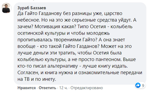 "А зачем? Мотивация какая? Типа Осетия - колыбель осетинской культуры и чтобы молодежь пропитывалась творениями Гайто? А она знает вообще - кто такой Гайто Газданов? Может на это лучше деньги эти тратить, чтобы Осетия была колыбелью культуры, а не просто пантеоном. Выше кто-то писал альтернативу - лучше книгу издать. Согласен, и книга нужна и ознакомительные передачи на ТВ и по инету", - считает пользователь Зураб Баззаев.