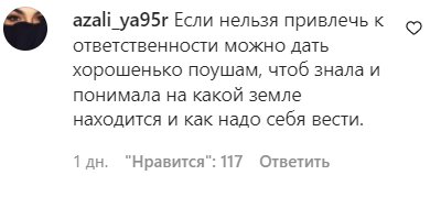 "Если нельзя привлечь к ответственности, можно дать хорошенько по ушам, чтоб знала и понимала, на какой земле находится и как надо себя вести", - предложил azali_ya95r.