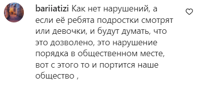 "Как нет нарушений? А если её ребята-подростки смотрят или девочки, и будут думать, что это дозволено, это нарушение порядка в общественном месте, вот с этого-то и портится наше общество", - написал bariiatizi.