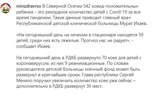 Главврач Республиканской детской клинической больницы Мурат Икаев сообщил, что всего в Северной Осетии 542 ребенка с положительным тестом на коронавирус, что является рекордным за все время пандемии. "На лечении в стационаре находятся 59 детей, среди них есть тяжелые", - приводятся 24 января слова Икаева на странице Минздрава Северной Осетии minzdravrso в Instagram.